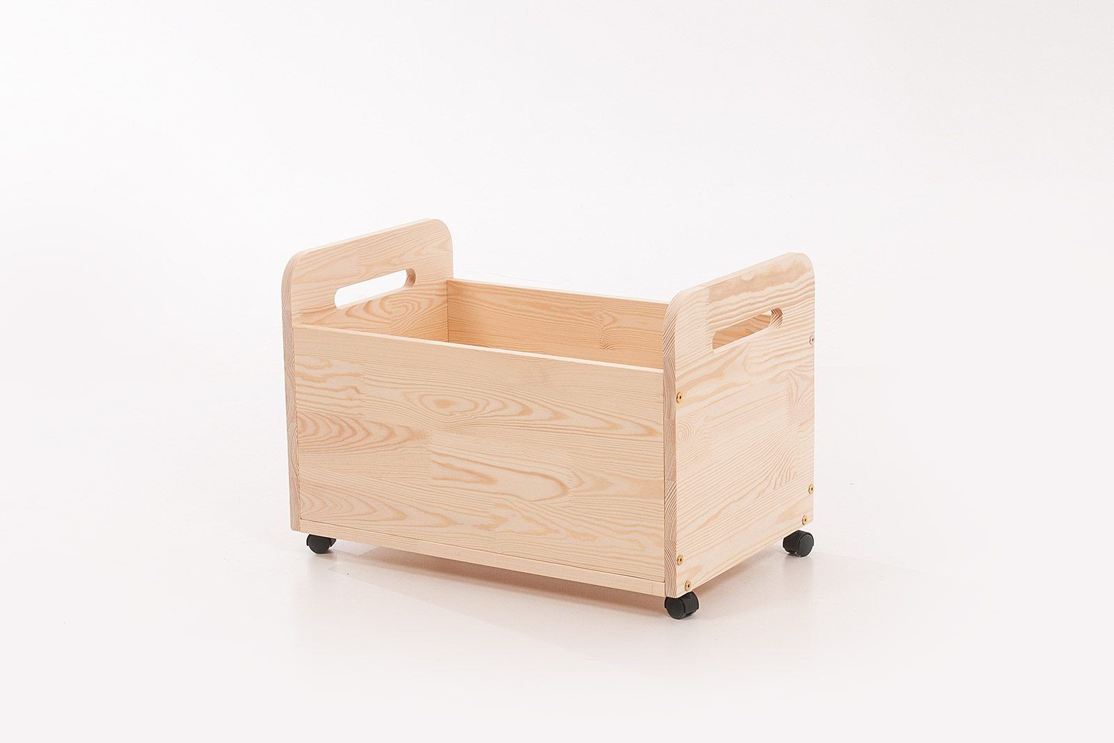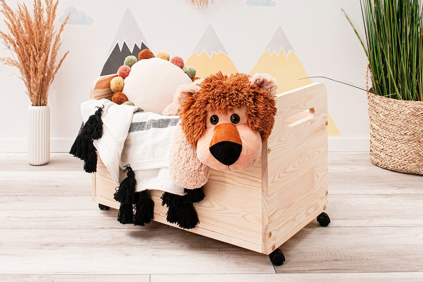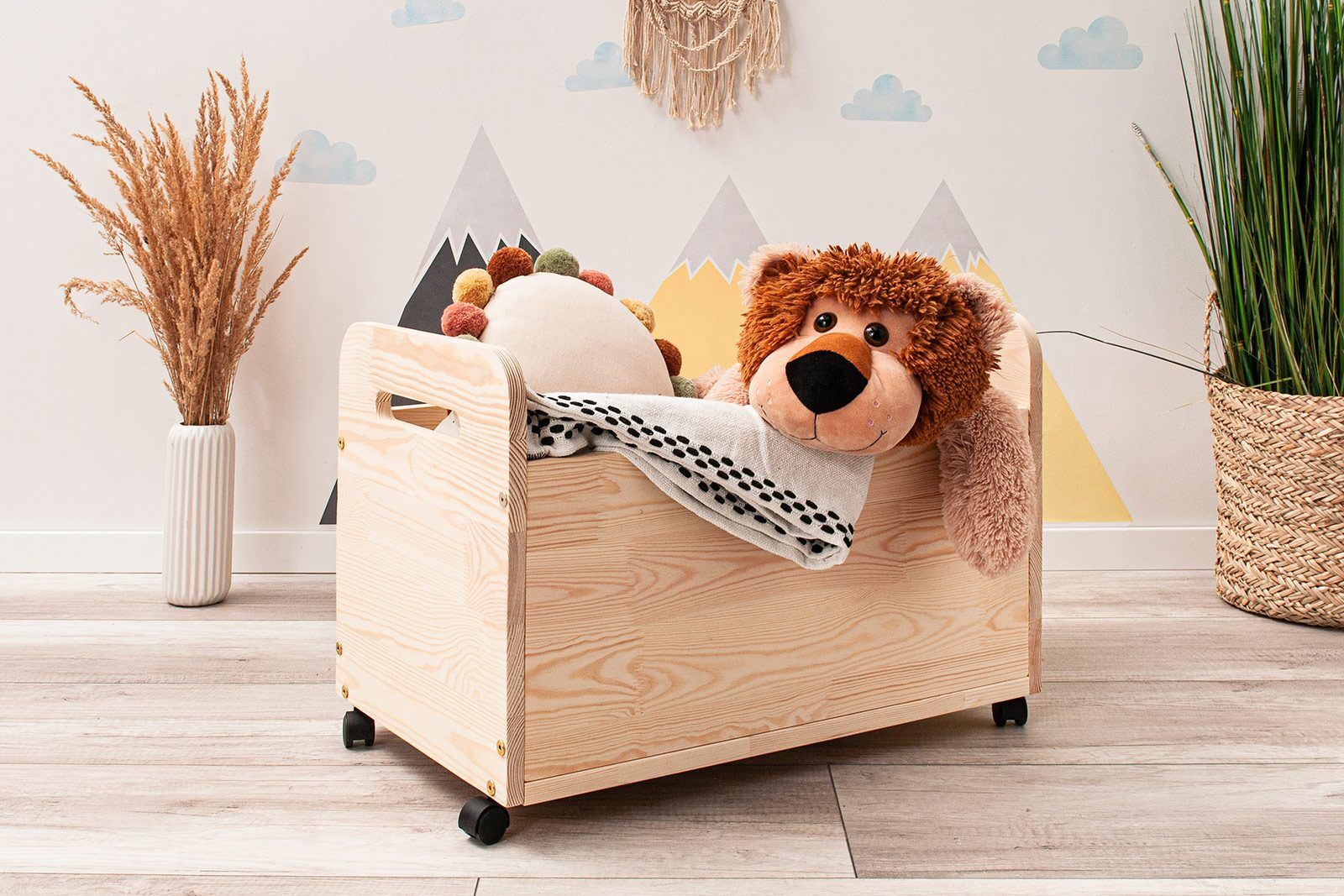 A caixa de brinquedos é feita de madeira de pinho natural e combina perfeitamente com os nossos outros móveis.