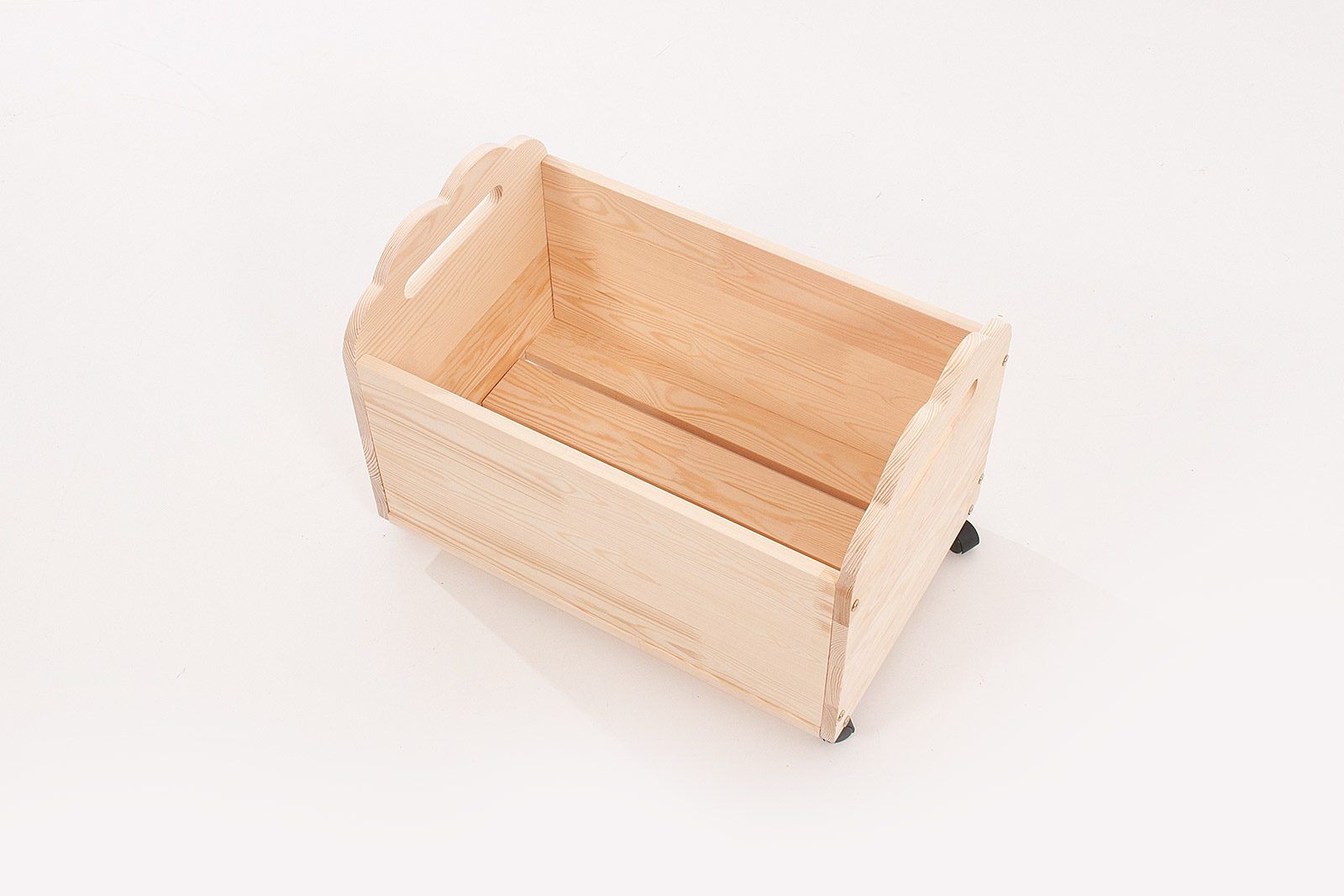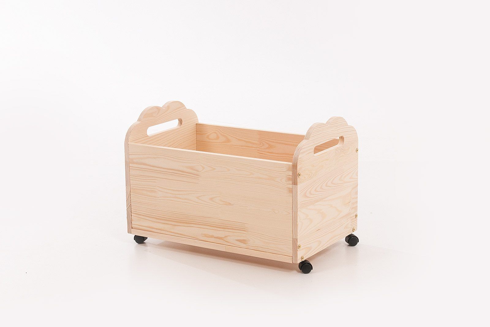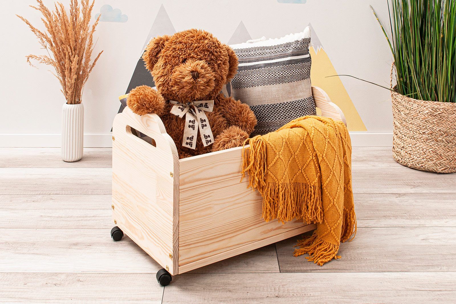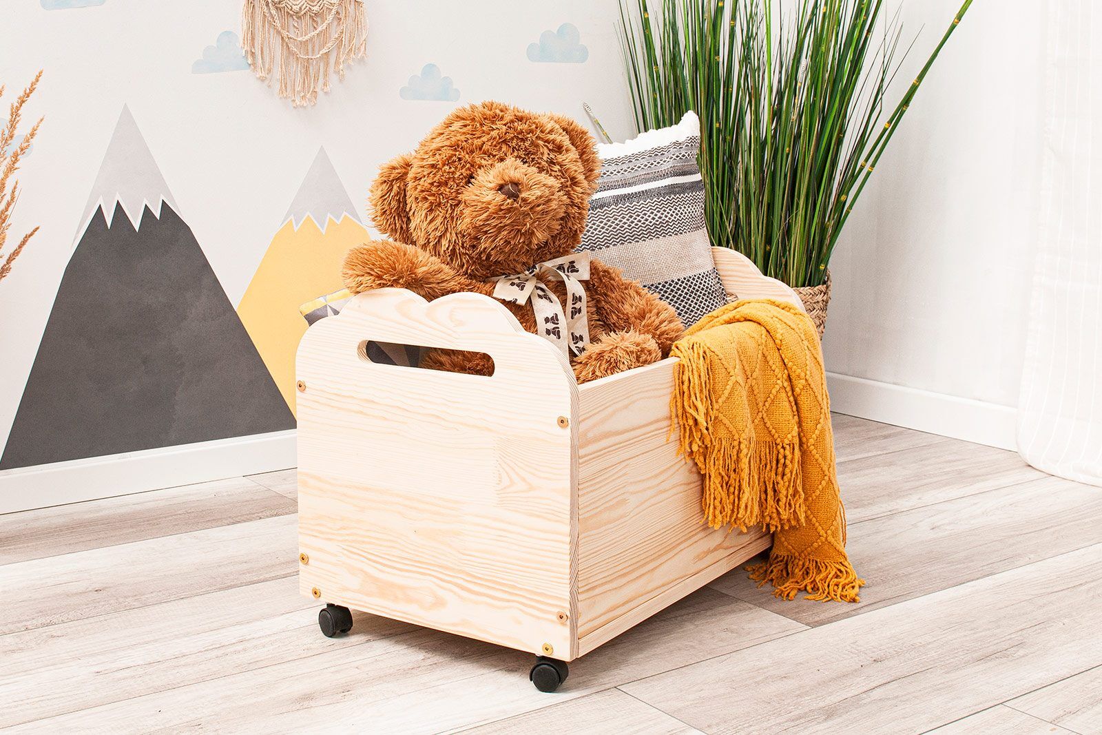 A caixa de brinquedos é feita de madeira de pinho natural e combina perfeitamente com os nossos outros móveis.