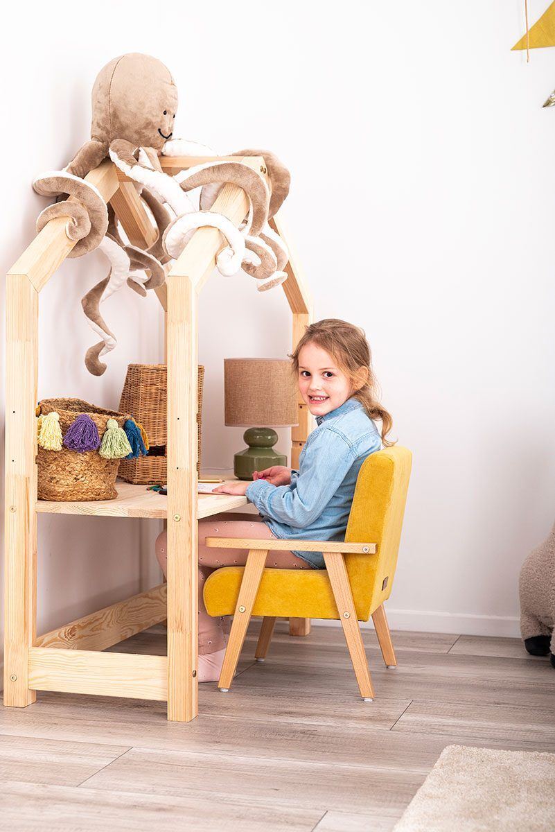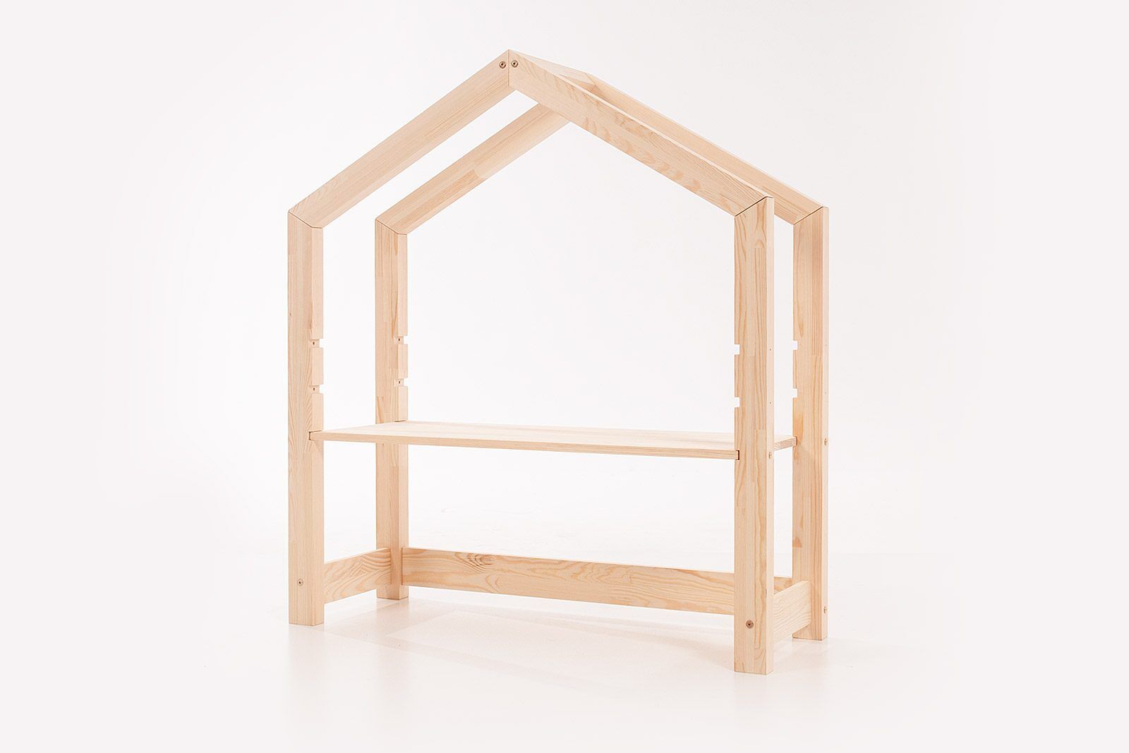 Uma secretária para crianças com a forma de uma casa feita de madeira de pinho natural. A secretária combina na perfeição com os nossos berços e outros móveis, criando em conjunto um design harmonioso para o quarto do seu filho.